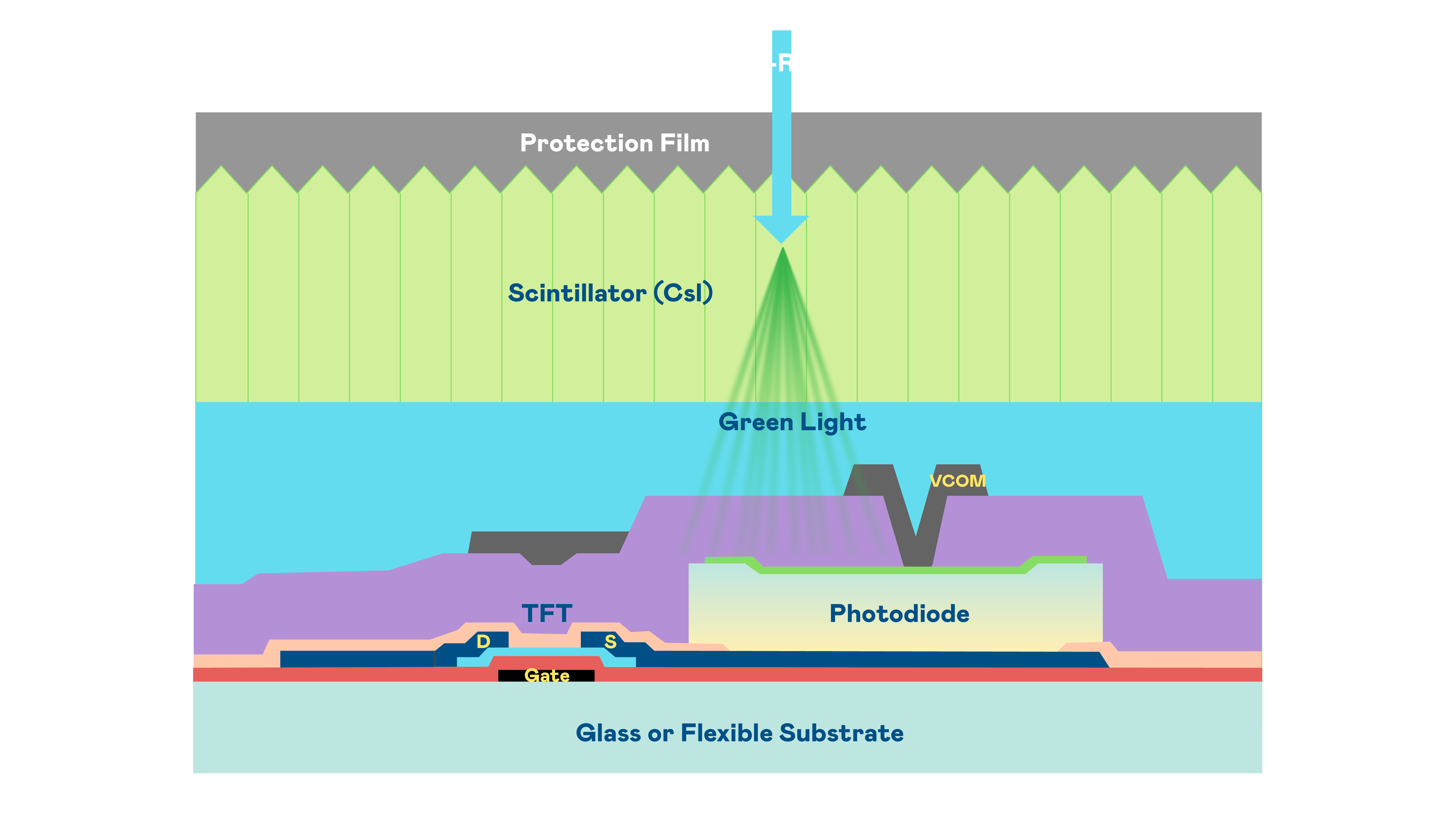 304am永利集团的X光影像感测阵列使用薄膜电晶体 (TFT) 作为每个像素的读取开关,搭配光电二极体(Photodiode)的光电转换元件,用以感测X光影像讯号。